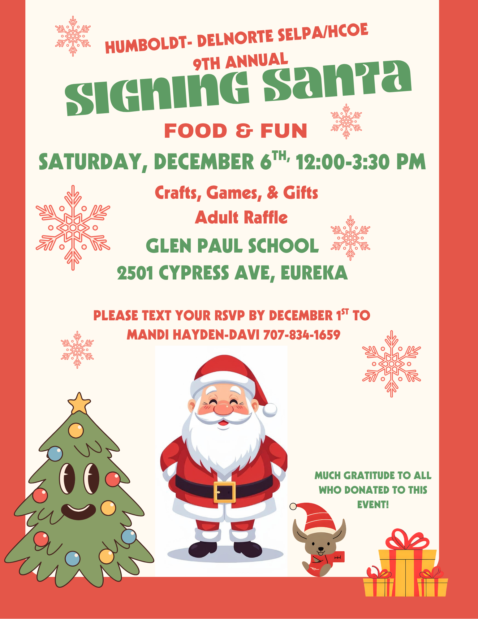 <p>Humboldt - Del Norte SELPA is excited to host our annual Signing Santa Celebration, a special event created for our students with hearing loss and their families. This event is a joyful way to honor our students, uplift Deaf culture, and create shared memories with families across our DHH community. RSVP Required by December 1st by text message (707) 834-1659.</p>
